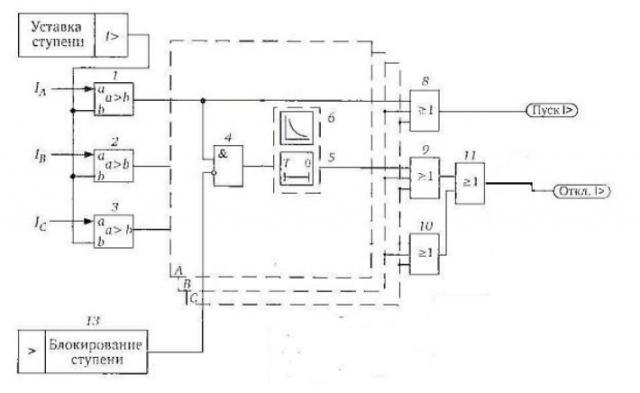 Блокирование срабатывания любой ступени МТЗ выполняется элементом 4 как внешним сигналом, так и в цикле АПВ. Сигнал блокирования поступает на элемент 13.