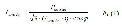 Для расчета уставок токовой отсечки необходимо знать номинальный ток электродвигателя. Если значение этой характеристики не приведено в документации двигателя, определить его можно по формуле (1):