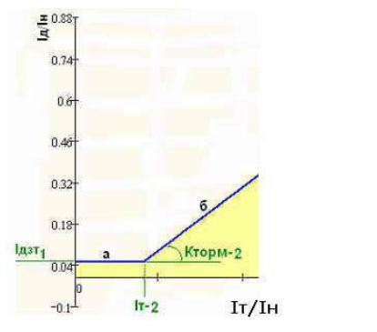 В блоках серий БМРЗ и БМРЗ-100, используемых для защиты электрических машин и трансформаторов, применяется алгоритм торможения, характеристика которого имеет два участка (рис. 7)
