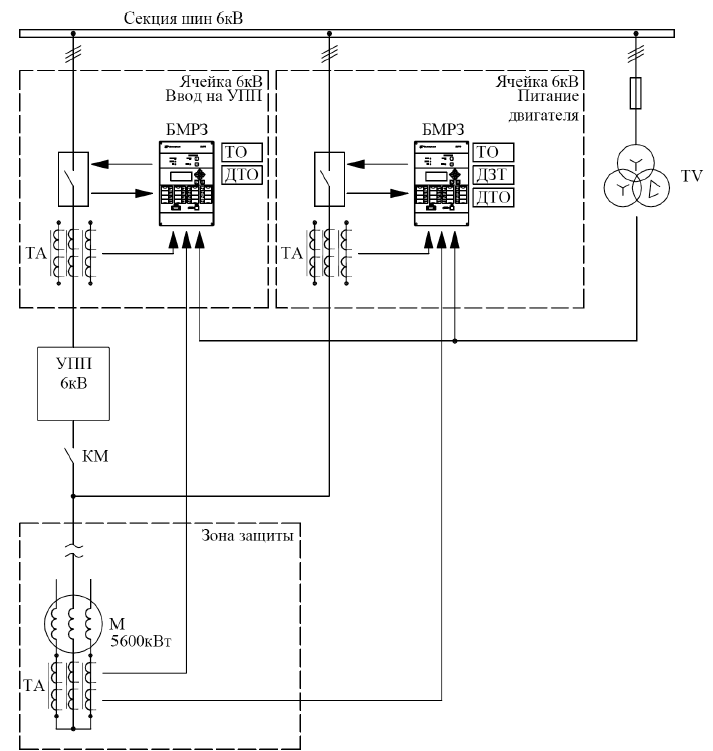 Схема с УПП асинхронного электродвигателя АО-3150-6000 и цифровыми блоками релейной защиты БМРЗ приведена на рис. 9.
