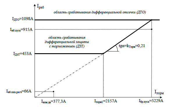 Выполнение соотношения (6-5) позволяет использовать выбранные трансформаторы тока в данной схеме защиты. Характеристика дифференциальной токовой защиты, построенная по результатам расчета приведена на рис. 10.