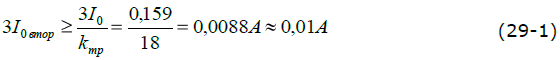 Ток срабатывания во вторичных значениях найдем по формуле (29-1), используя значение коэффициента трансформации для выбранного трансформатора тока нулевой последовательности типа ТЗР (табл.1):