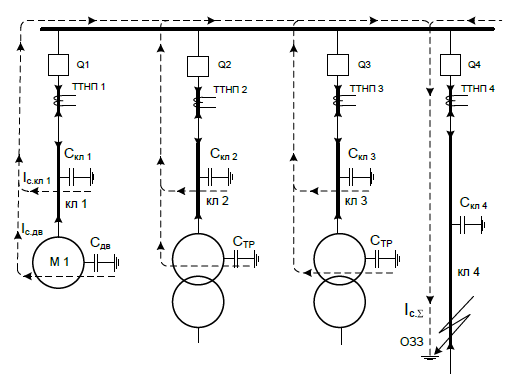 Пусть в кабельной линии кл4 возникло однофазное замыкание на землю ОЗЗ. После окончания переходного процесса, связанного с перезарядом емкостей сети Скл1 – Скл4, двигателя Сдв и трансформаторов Стр, весь суммарный емкостной ток