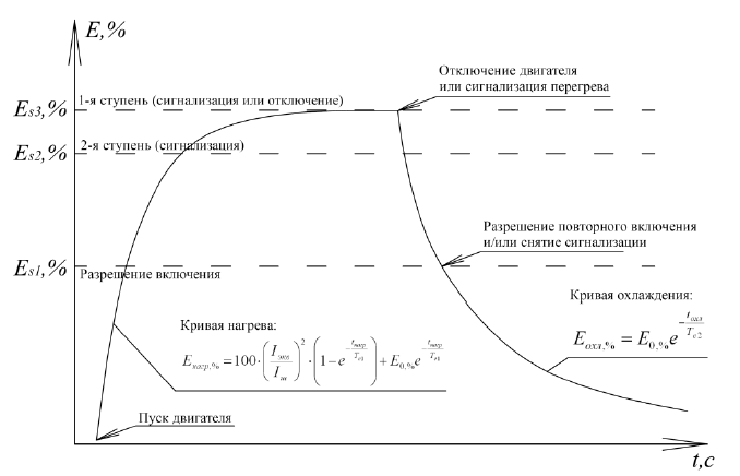 После завершения эксперимента на основе полученных значений строится график процессов нагрева и охлаждения. На графике установившееся значение перегрева, индицируемое на дисплее БМРЗ, приравнивается к установившейся температуре двигателя при постоянной нагрузке.