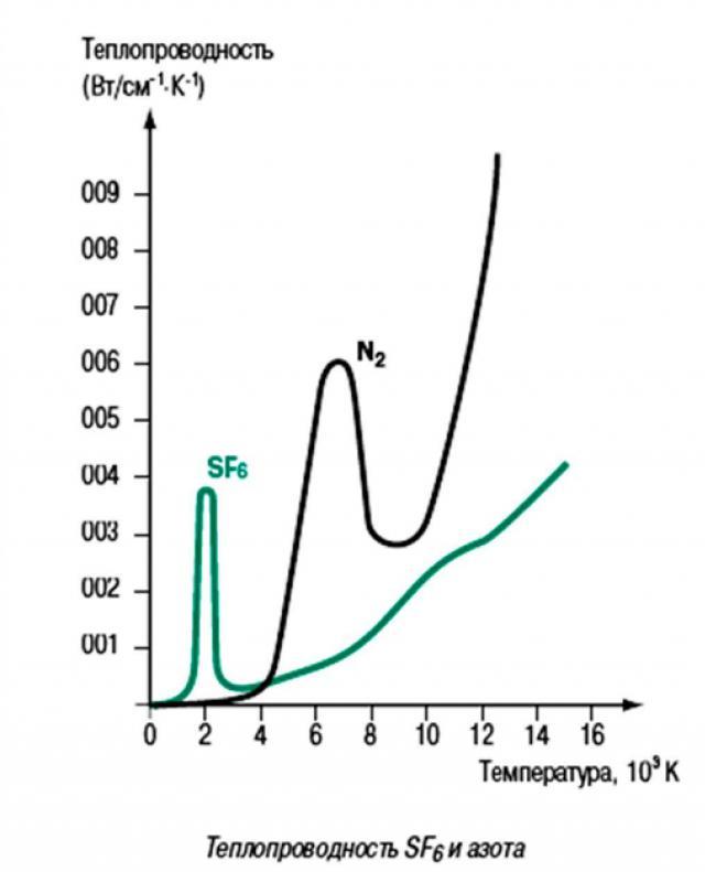 Как видно из графика теплопроводности, при температурах около 2000 К теплоемкость элегаза резко увеличивается вследствие диссоциации (распад молекул на ионы). Поэтому теплопроводность плазмы, а следовательно и дугогасительная способность элегаза в области температур 2000 - 3000 К при прочих равных условиях значительно выше (на два порядка), чем воздуха.
