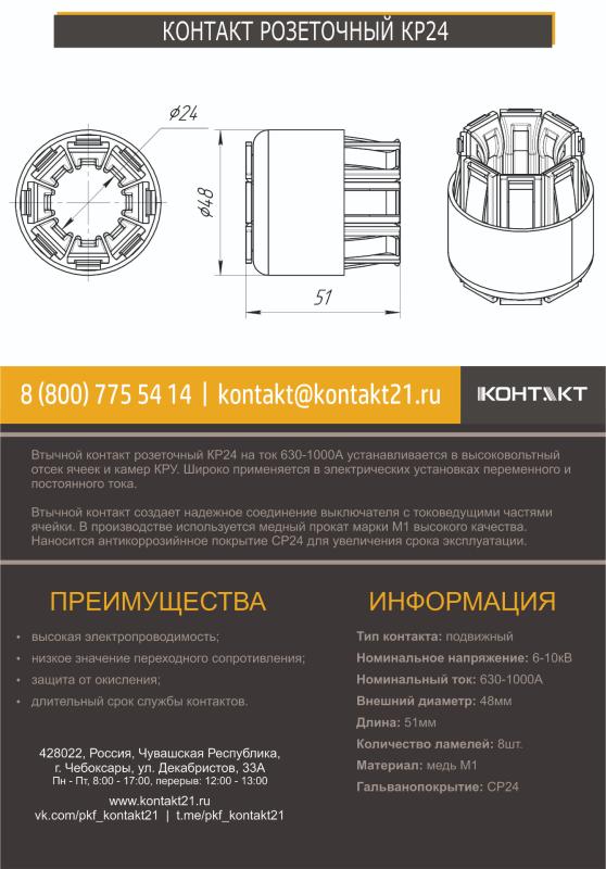 Втычной контакт розеточный КР24 на ток 630-1000А устанавливается в высоковольтный отсек ячеек и камер КРУ. Широко применяется в электрических установках переменного и постоянного тока.