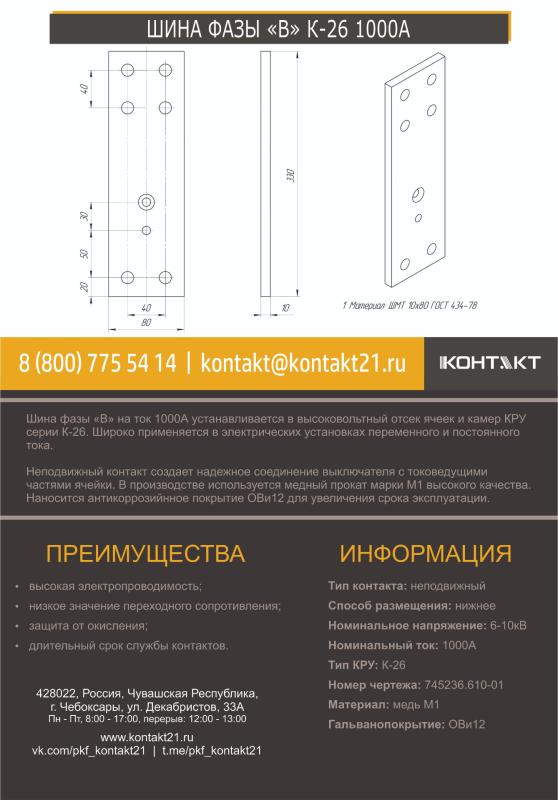 Шина фазы «В» на ток 1000А устанавливается в высоковольтный отсек ячеек и камер КРУ серии К-26. Широко применяется в электрических установках переменного и постоянного тока.