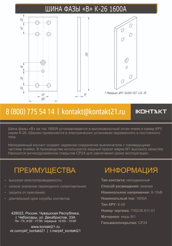 Шина фазы «В» на ток 1600А устанавливается в высоковольтный отсек ячеек и камер КРУ серии К-26. Широко применяется в электрических установках переменного и постоянного тока.