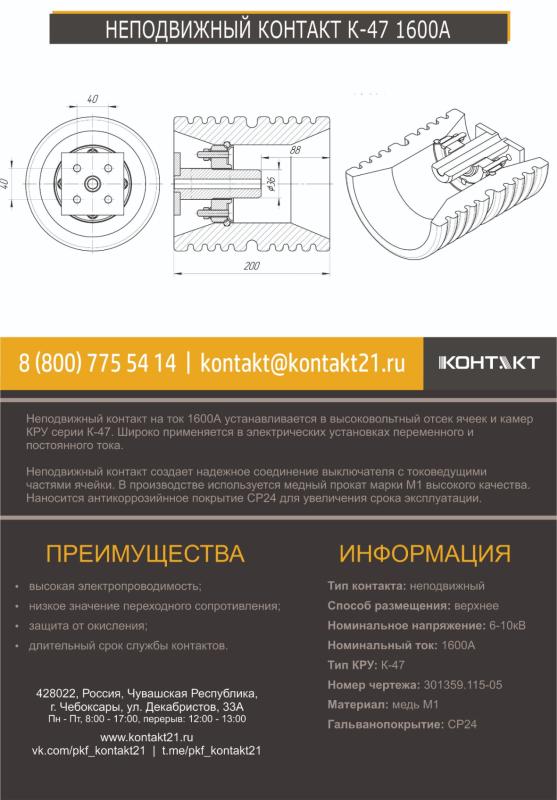 Неподвижный контакт на ток 1600А устанавливается в высоковольтный отсек ячеек и камер КРУ серии К-47. Широко применяется в электрических установках переменного и постоянного тока.