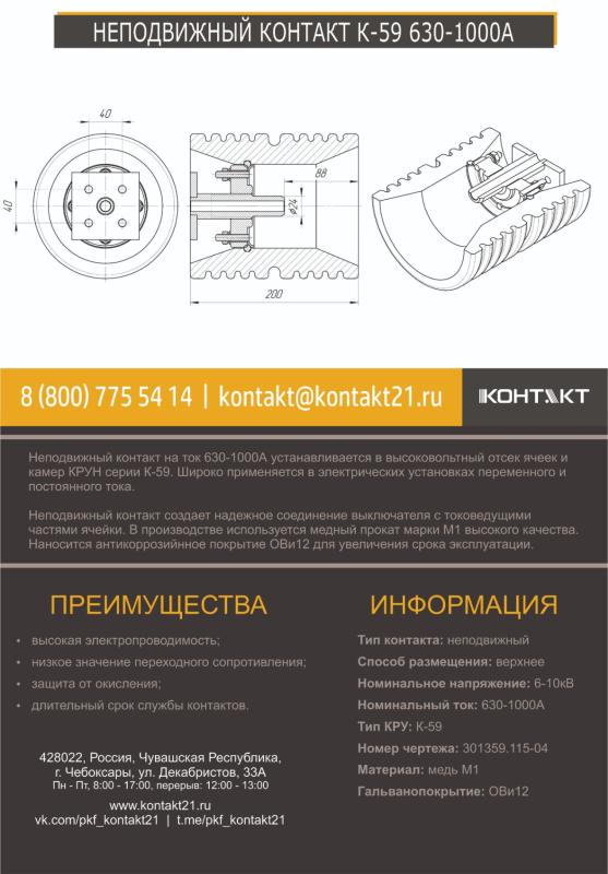 Неподвижный контакт на ток 630-1000А устанавливается в высоковольтный отсек ячеек и камер КРУН серии К-59. Широко применяется в электрических установках переменного и постоянного тока.