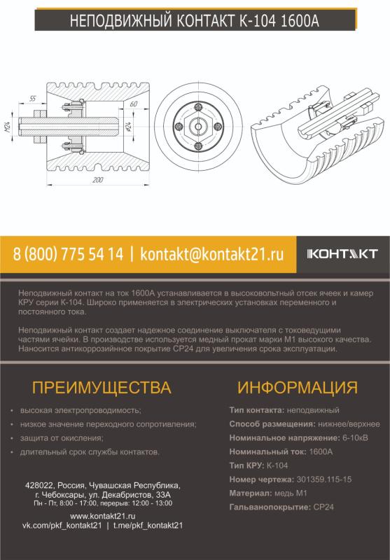 Неподвижный контакт на ток 1600А устанавливается в высоковольтный отсек ячеек и камер КРУ серии К-104. Широко применяется в электрических установках переменного и постоянного тока.