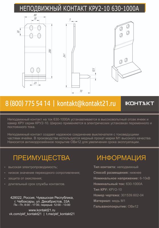 Неподвижный контакт на ток 630-1000А устанавливается в высоковольтный отсек ячеек и камер КРУ серии КРУ2-10. Широко применяется в электрических установках переменного и постоянного тока.