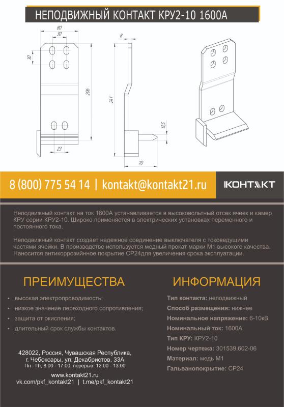 Неподвижный контакт на ток 1600А устанавливается в высоковольтный отсек ячеек и камер КРУ серии КРУ2-10. Широко применяется в электрических установках переменного и постоянного тока.