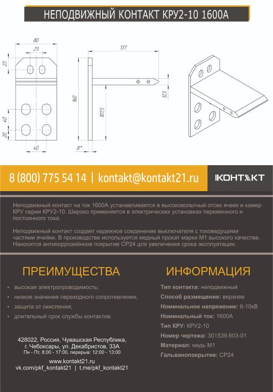 Неподвижный контакт на ток 1600А устанавливается в высоковольтный отсек ячеек и камер КРУ серии КРУ2-10. Широко применяется в электрических установках переменного и постоянного тока.