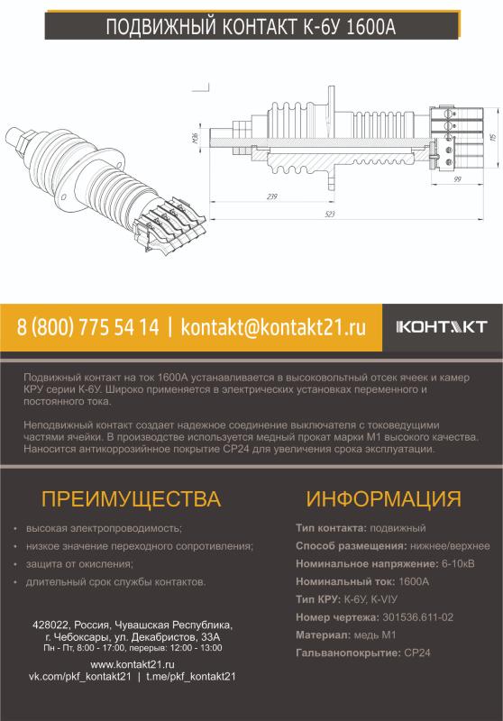 Подвижный контакт на ток 1600А устанавливается в высоковольтный отсек ячеек и камер КРУ серии К-6У. Широко применяется в электрических установках переменного и постоянного тока.