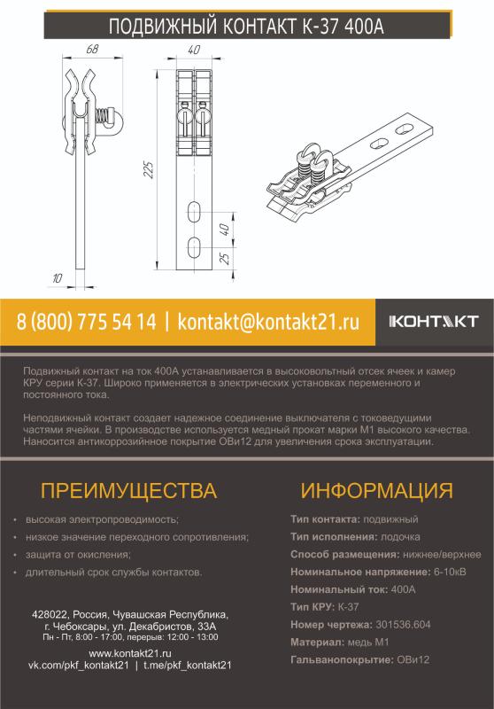 Подвижный контакт на ток 400А устанавливается в высоковольтный отсек ячеек и камер КРУ серии К-37. Широко применяется в электрических установках переменного и постоянного тока.