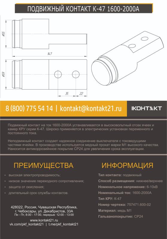 Подвижный контакт на ток 1600-2000А устанавливается в высоковольтный отсек ячеек и камер КРУ серии К-47. Широко применяется в электрических установках переменного и постоянного тока.