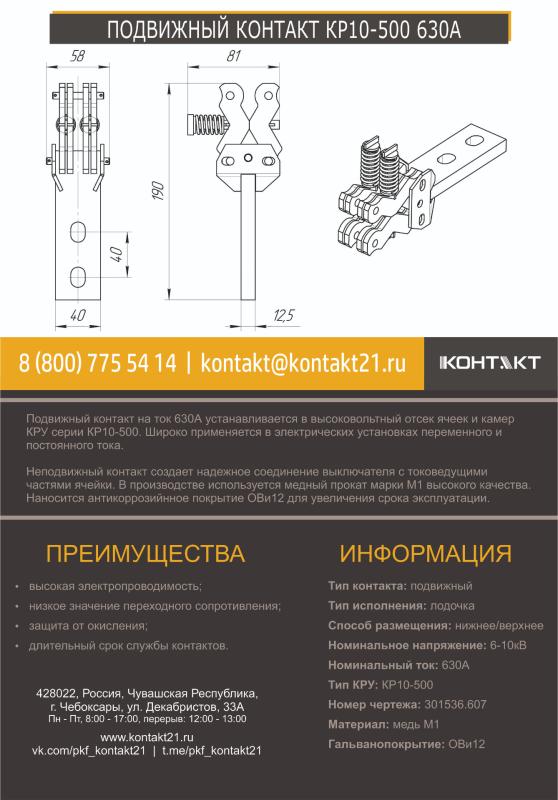 Подвижный контакт на ток 630А устанавливается в высоковольтный отсек ячеек и камер КРУ серии КР10-500. Широко применяется в электрических установках переменного и постоянного тока.