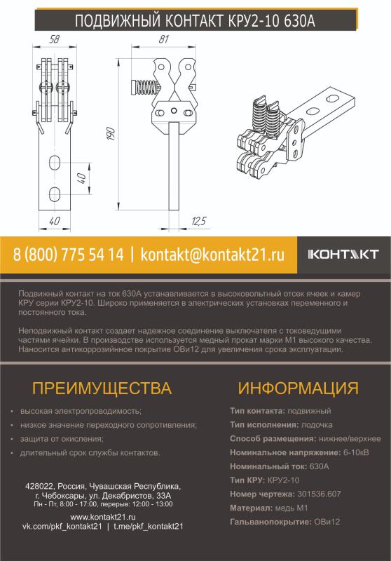 Подвижный контакт на ток 630А устанавливается в высоковольтный отсек ячеек и камер КРУ серии КРУ2-10. Широко применяется в электрических установках переменного и постоянного тока.