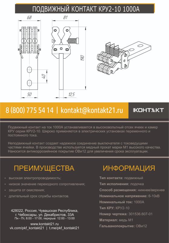 Подвижный контакт на ток 1000А устанавливается в высоковольтный отсек ячеек и камер КРУ серии КРУ2-10. Широко применяется в электрических установках переменного и постоянного тока.