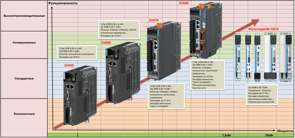 Серводрайверы Inovance включают серию SV (от 50 Вт до 7,5 кВт) для моторов MS1 и серию мультидрайв-преобразователей с общим выпрямителем IS810 (от 50 Вт до 70 кВт) для моторов ISMG и MS1.